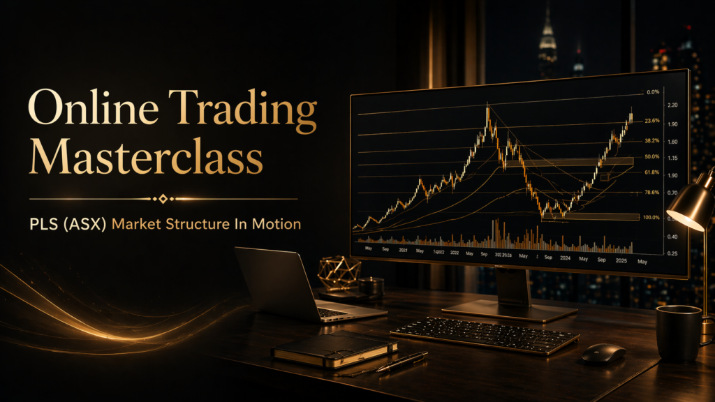 This online trading masterclass demonstrates how professional chart structure is built step by step using the ASX stock PLS as a real market example. Before we begin, it is important to understand what you are actually looking at on this page. This is not a trading signal page. It is not a prediction page. It is not random lines drawn after the fact. What you are about to see is the finished result of a disciplined chart preparation process built on structure, proportion, and market behaviour.