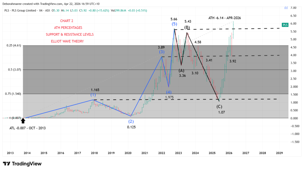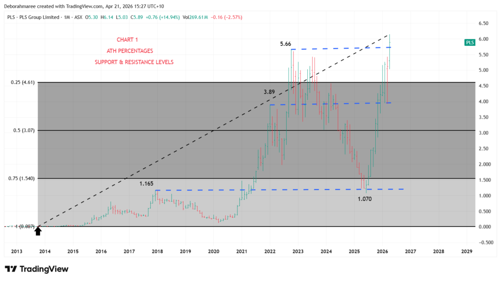 PLS represents a complete structural case study. It expanded from its all-time low of $0.007 in October 2013 to its all-time high of $6.14 in April 2026. Along the way it produced deep corrections, breakout phases, powerful momentum runs, and major retests of prior structure. Strong trends expose behaviour. Corrections expose proportion.